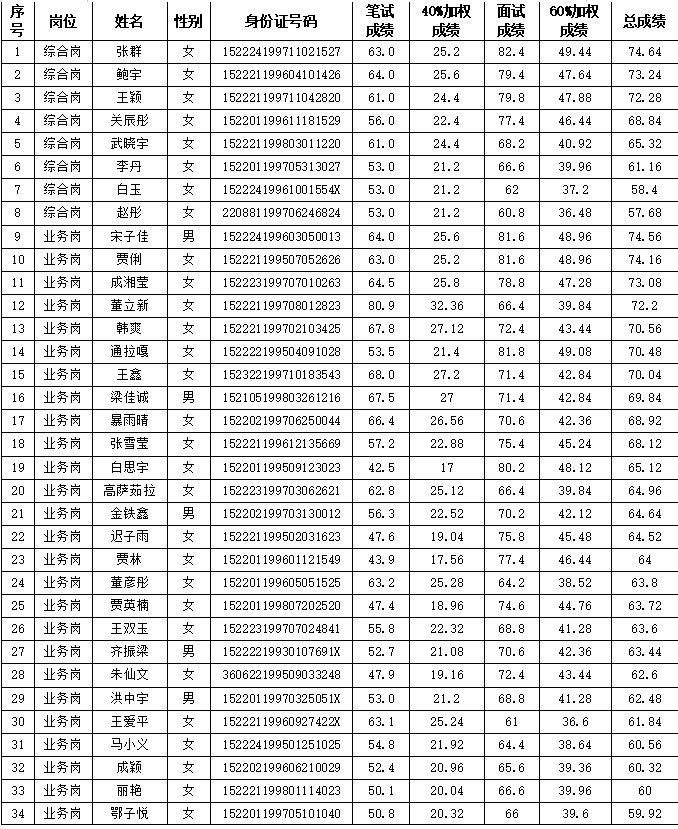 根據(jù)《內(nèi)蒙古農(nóng)村信用社2019-2020年度全區(qū)法人機(jī)構(gòu)應(yīng)屆高校畢業(yè)生校園招聘簡章》要求,2019年12月1日,烏蘭浩特市農(nóng)村信用合作聯(lián)社圓滿完成了2019-2020年校園招聘面試工作?,F(xiàn)將面試人員按筆試與面試4:6比例加權(quán)計算總成績予以公布(詳見附件)。