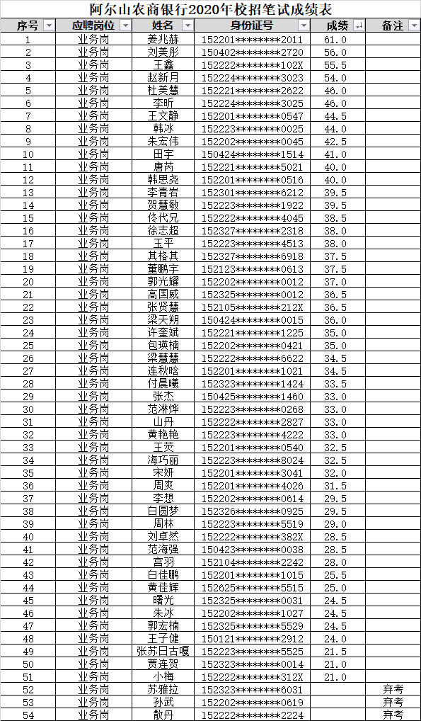 阿爾山農(nóng)商銀行關(guān)于2020年度校園招聘筆試成績(jī)的公告